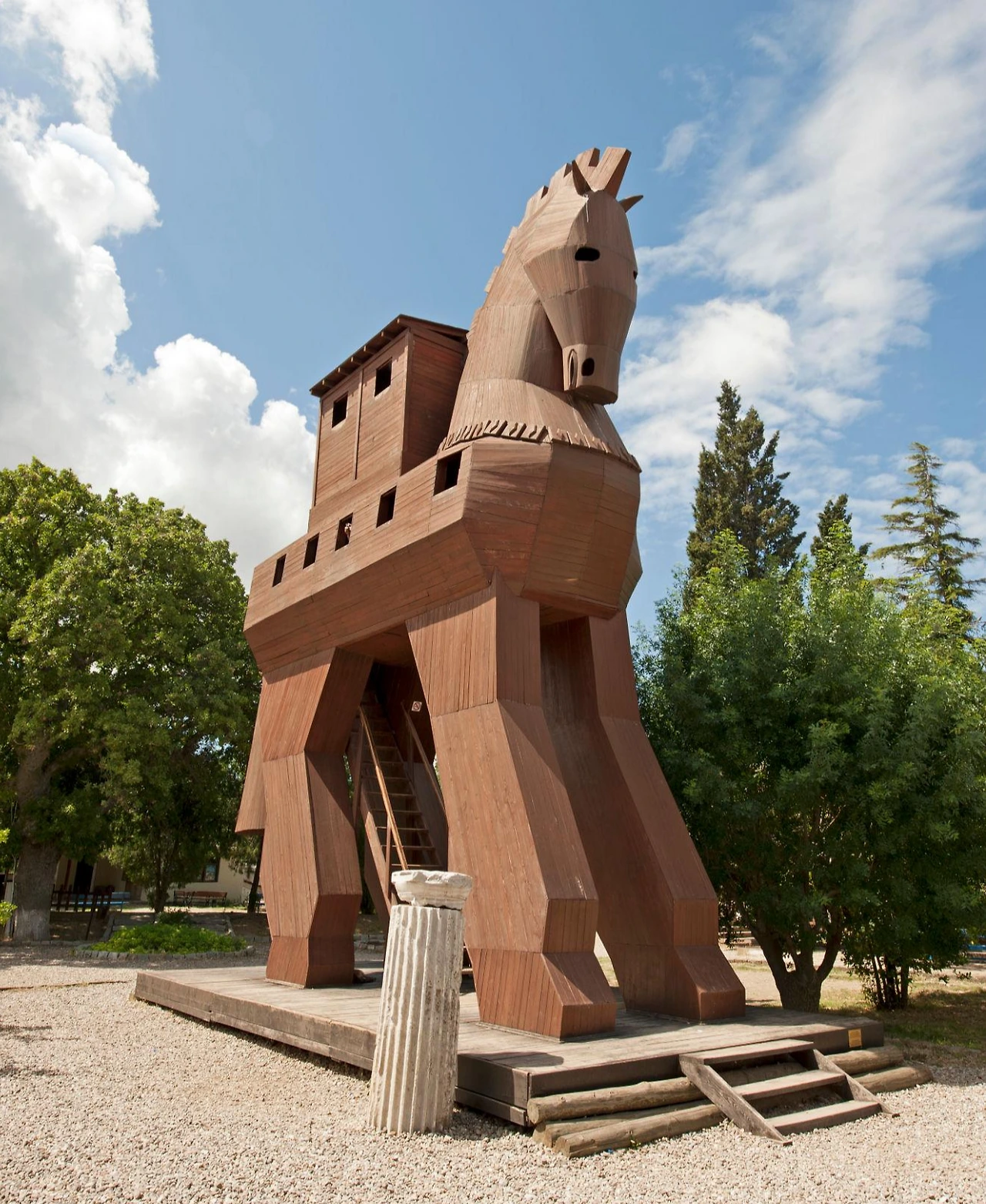 튀르키예 트로이 유적지 내부에 세워진 관람용 목마는 고대 유물이 아니라, 『일리아드』의 마지막 계략을 공간적으로 이해하도록 돕는 재현물이다. 내부에 출입구와 계단이 있어 관람자가 직접 들어가 볼 수 있게 설계되었고, 이는 ‘이야기를 보는’ 차원을 넘어 몸으로 상상하게 만드는 장치라는 성격을 분명히 한다. 주변의 낮은 성벽 잔해와 대비되며, 발굴된 돌의 시간과 서사의 시간이 한 자리에서 겹쳐진다.