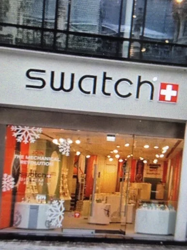 (사진: 뮈헨의 마리엔 광장 주변의 상가 , 스위스 시계 브랜드 Swatch(스와치) 단독 매장 전경.