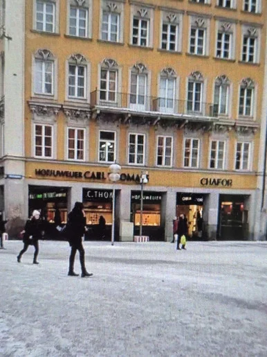 (사진2: 노란색 외벽과 동일한 리듬의 창문이 반복되는 전통 유럽식 건물. 1층에는 Carl Thomass / Chafor / C. Thomass 등 보석/시계/명품 관련 상점들이 입점.)