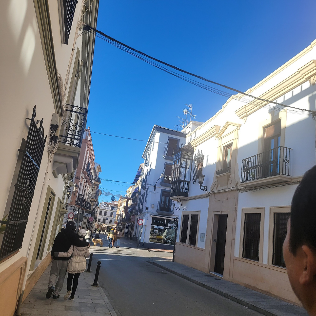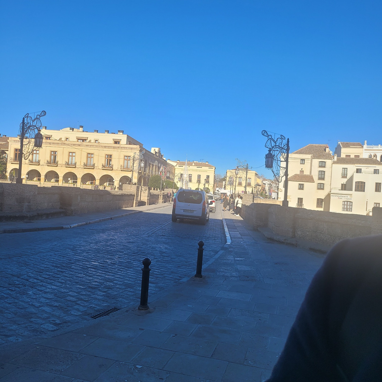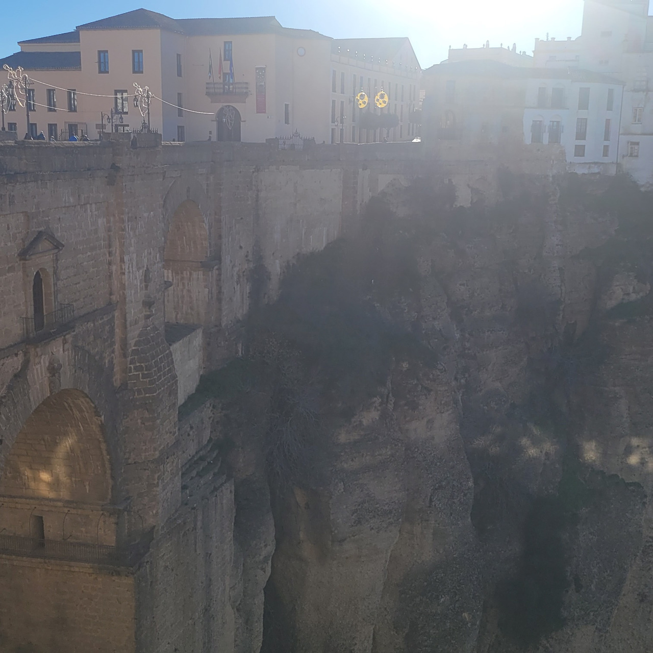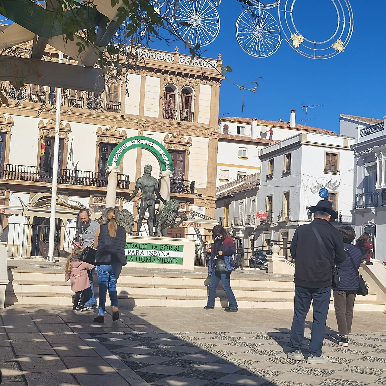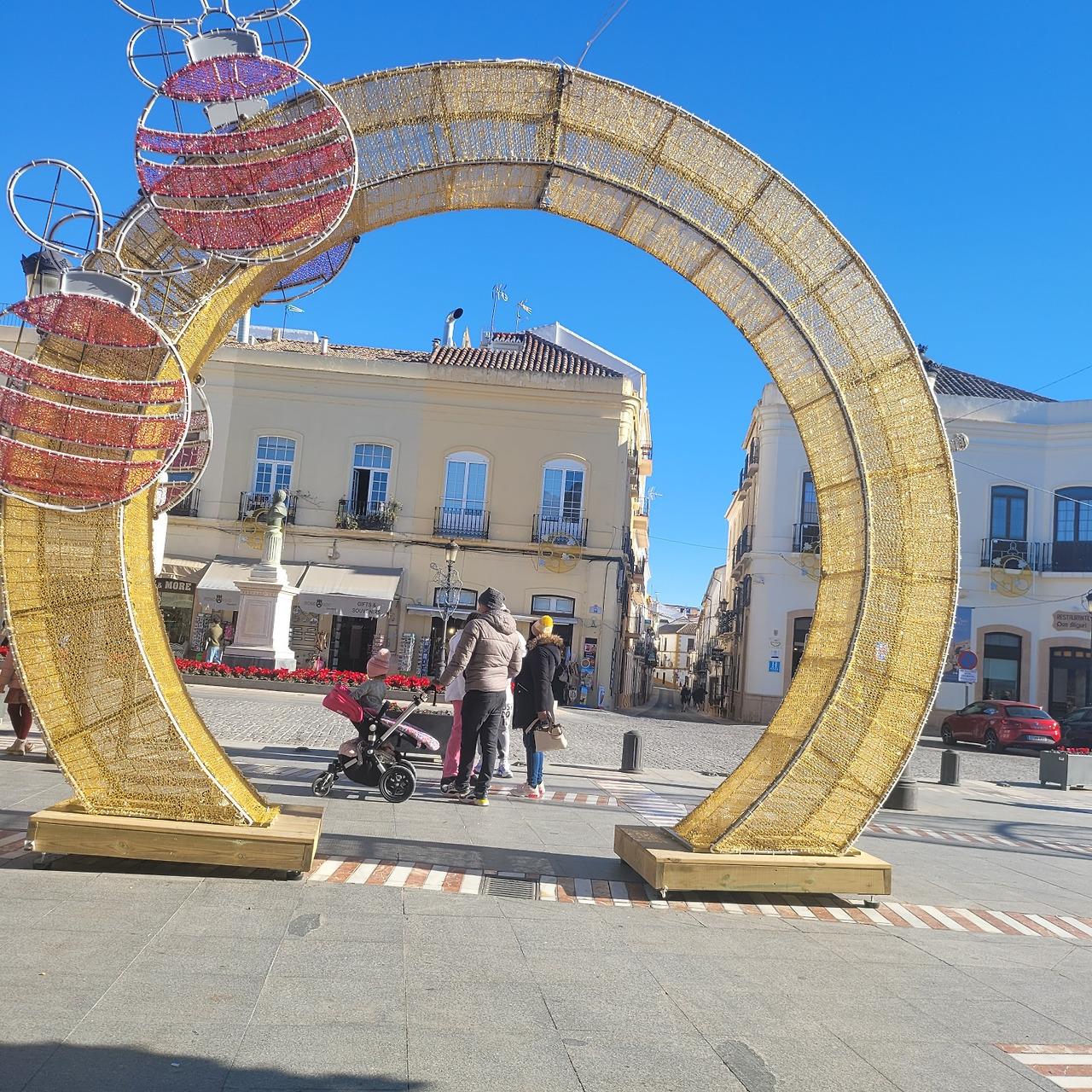 론다(Ronda)의 중심 광장에 설치된 크리스마스 시즌 장식물. 황금빛으로 빛나는 커다란 원형 아치는 마치 도시의 입구이자 통과의 문처럼 서 있고, 위쪽에 달린 붉은 장식 공(크리스마스 오너먼트)들이 축제의 계절감을 분명하게 드러낸다. 장식 자체는 현대적인 임시 구조물이지만, 뒤편에 보이는 연한 베이지색의 전통 건물들과 조화를 이루며 “오래된 도시 위에 잠시 내려앉은 시간의 장식”처럼 보인다.