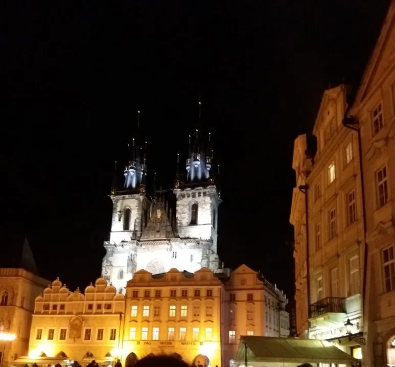 고딕 양식의 두 개의 첨탑은 틴 성당(Church of Our Lady before Týn)이며, 프라하의 스카이라인을 대표하는 상징이다. 어둠 속에서 두 첨탑은 마치 “두 손을 모은 인간의 마음”처럼 보인다. 프라하는 전쟁과 분열, 종교 갈등을 겪었던 도시이다. 그 어두운 역사를 품은 채, 성당의 불빛은 조용히 도시를 비추고 있다.