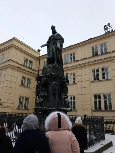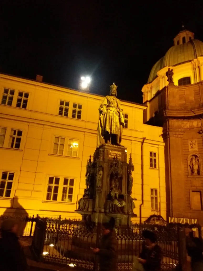 조명을 받아 황금빛으로 빛나는 동상이다. 이 인물상은 신성로마제국의 황제이자 프라하 대학(현 카렐 대학)을 세운 카를 4세(Karel IV)이다. 체코는 그를 ‘체코의 아버지’라고 부르며, 지금도 국가에서 가장 존경받는 통치자 중 한 명이다. 이 동상은 단순한 조각상이 아니라, ‘프라하가 유럽의 중심이었던 그 찬란했던 시절’의 기억을 상징하고 있다.