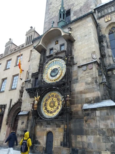 프라하의 명물인 구시청사(Old Town Hall)이다. 그 아래에는 세계에서 가장 오래된 천문시계(Orloj)가 걸려 있다. 시간·태양·달·별자리·계절이 정교하게 움직인다. 내일 낮에 천문시계에서 열리는 퍼포먼스를 볼 수 있다.