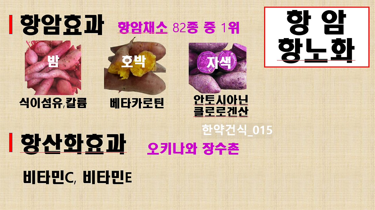일본 도쿄대 의과학 연구소에 따르면 고구마의 발암억제율이 항암효과 있는 채소 82종 가운데 1위를 차지했다.