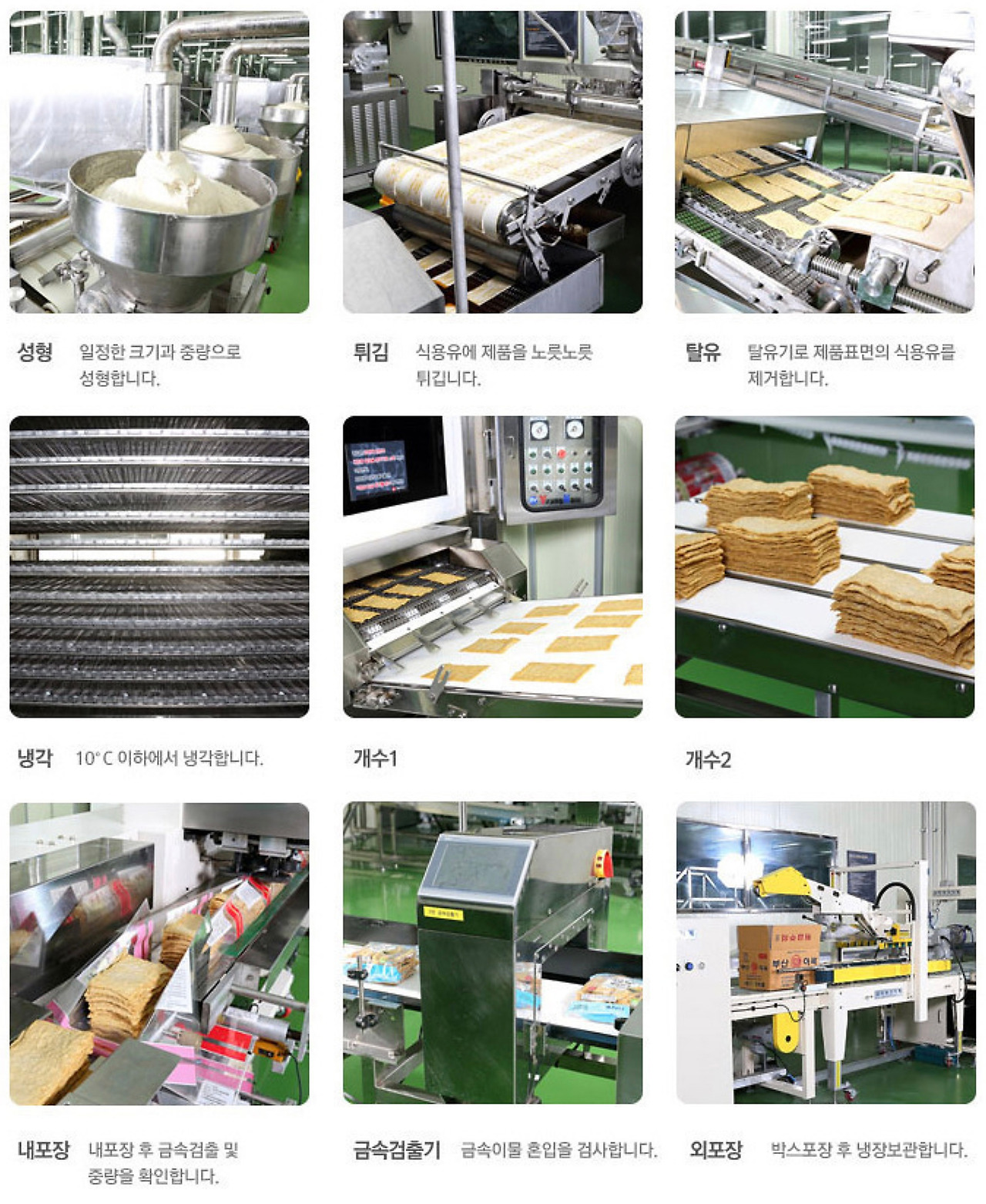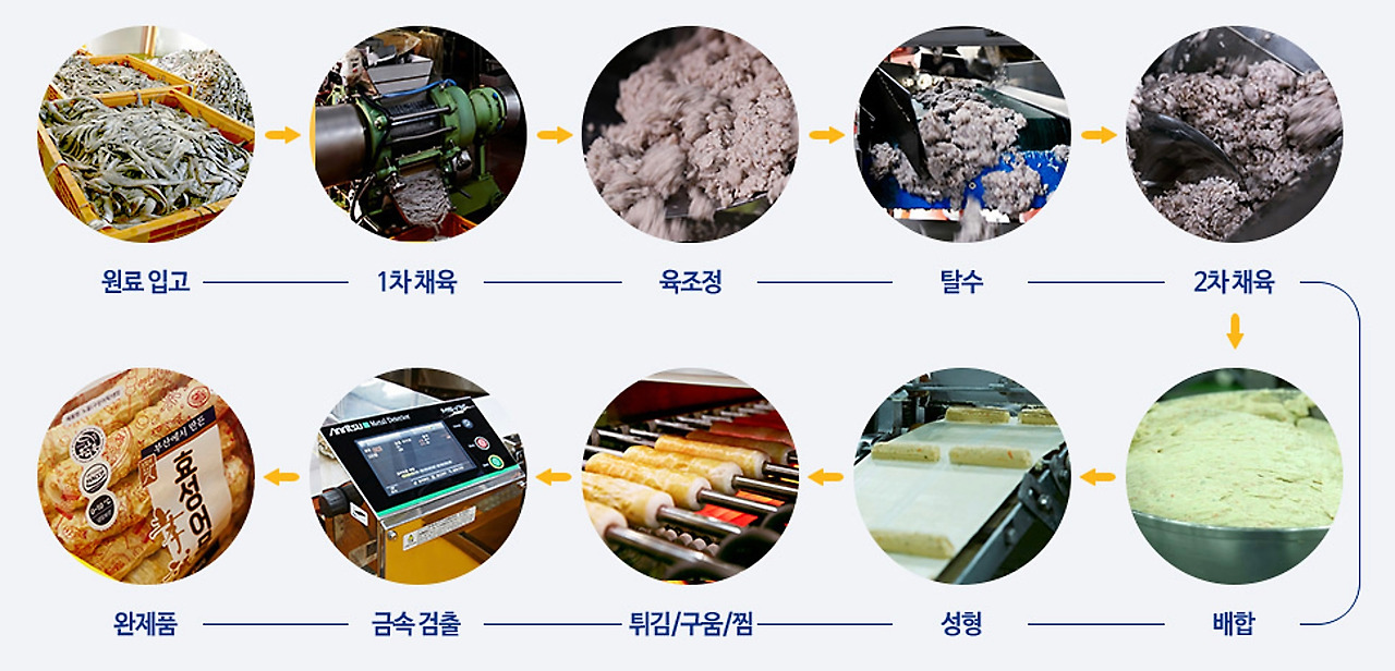 어묵 제품은 HACCP(위해요소중점관리기준) 필수 품목입니다. 따라서 모든 어묵공장은 위생적인 환경에서 만들어지고 있습니다. 시장이나 마트에서 만드는 즉석어묵에 비해 훨씬 위생적인 제품이라고 볼 수 있습니다. 어묵은 통상적으로 성형(모양내기)-프라이(튀기기)-탈유(기름 빼기)-냉각(10℃)-계수(추리기)-내포장(비닐)-검사(X레이, 금속검출기)-외포장(카톤박스) 과정을 거쳐 생산됩니다. 어묵 만드는 과정은 공장마다 큰 차이가 없으나, 생선으로 연육을 직접 만드는 공장은 손에 꼽힐 정도입니다.