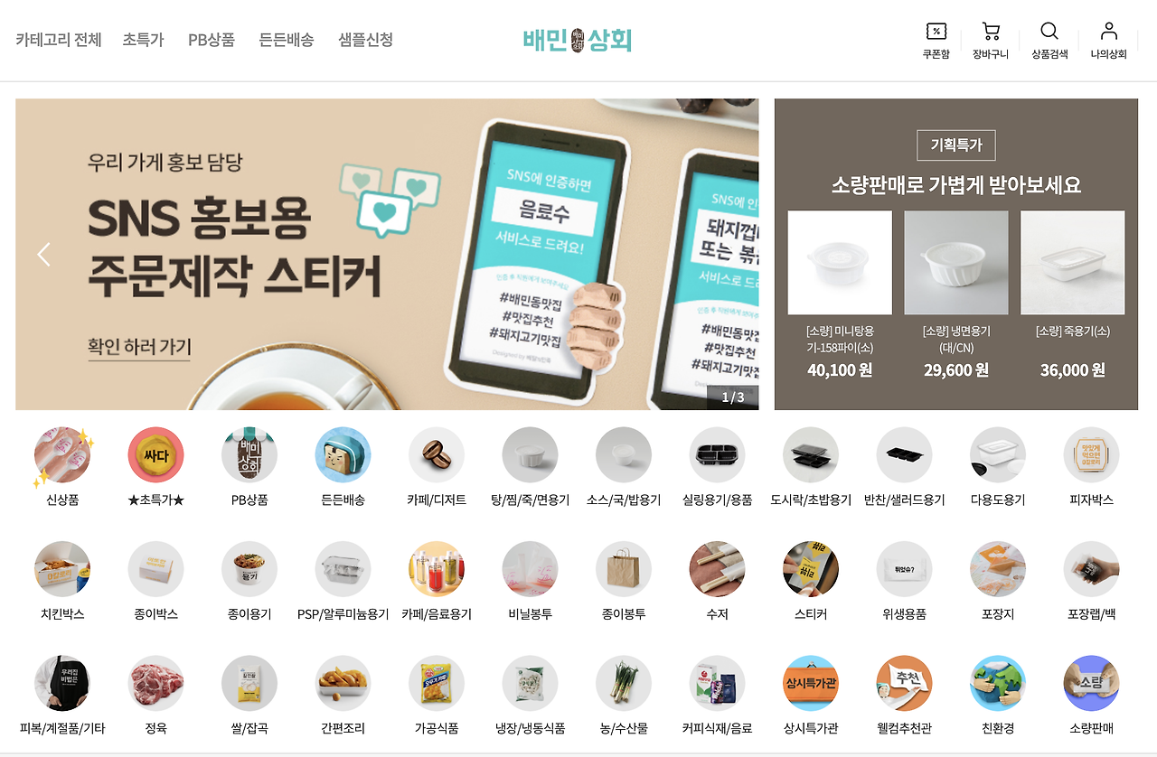 '배민상회'는 배달의민족 광고 관리 사이트인 '배민사장님광장'을 통해 서비스를 제공하기 시작했습니다. 배달업소에서 자주 사용하는 일회용품에 예쁜디자인을 더해 판매함으로써 큰 호응을 얻었으며, 현재는 신선식품까지 확장하고 있습니다. 수도권 지역은 당일 15시까지 주문하면 익일 배송되고 있으며, 물류 환경을 개선하기 위하여 물류 전문 회사와 제휴를 추진하고 있습니다.