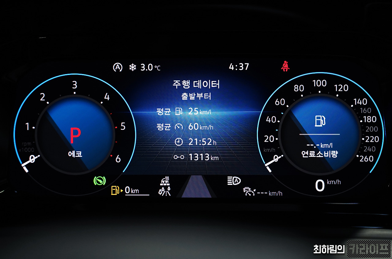 트립컴퓨터상으로 확인되는 주행거리는 377km, 주행시간 6시간 15분, 평균속도 60km/h, 평균연비 25.7km/L다. 정리해 보면 평균속도는 내려갔고, 평균연비는 2.9km/L가 더 늘었다. 가장 인상적인 건 주행가능거리 840km. 강원도 양양에서 200km를 달렸음에도 10km가 늘었다.