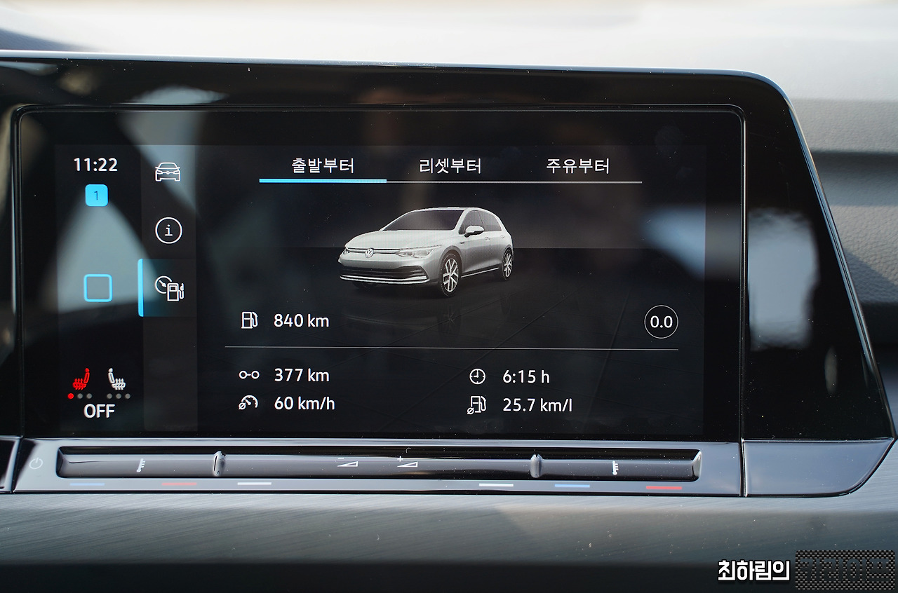 8세대 골프와 함께 한 연비리뷰 결과는 다음과 같다. 트립컴퓨터상으로 확인되는 주행거리는 1313km, 주행시간은 21시간 53분, 평균속도는 60km/h, 평균연비는 25.7km/L. 아무래도 고속도로를 달리다 보니 평균속도가 오르게 됐고, 코스팅 모드를 자주 썼음에도 평균연비는 소폭 떨어지게 됐다. 아마 이 구간도 국도를 이용해 달렸었다면 평균연비 저하가 지금의 수치보다는 미미했을 수 있다고 생각한다.