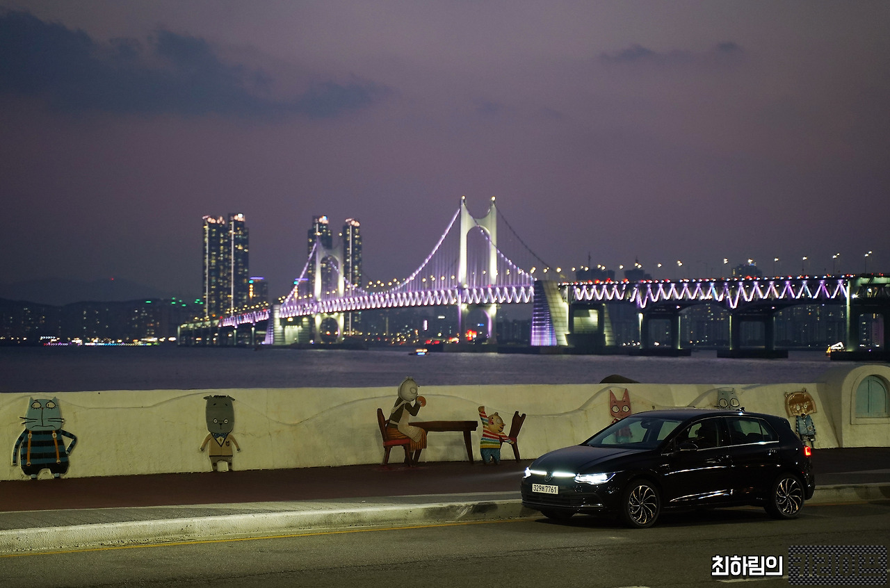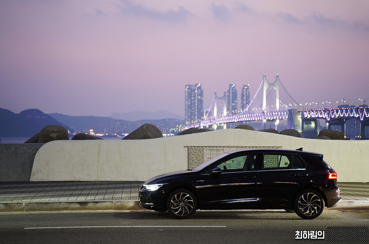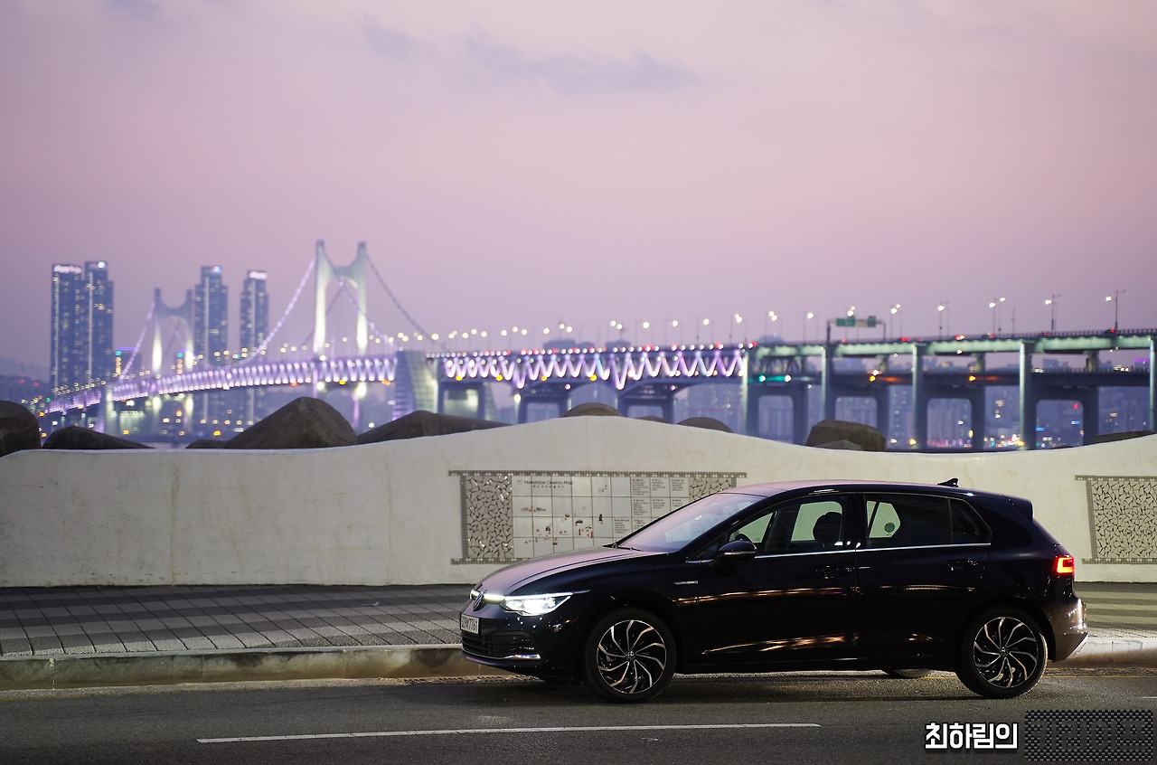 그렇게 부산 광안대교에 들르게 됐다. 부산 광안대교를 배경으로 8세대 골프 이미지를 몇 장 담아봤다. 외장 색상이 퓨어 화이트가 아니라 아쉽긴 하지만, 딥 블랙도 핑크빛 하늘과 분위기 있게 잘 담아냈다고 자평한다.