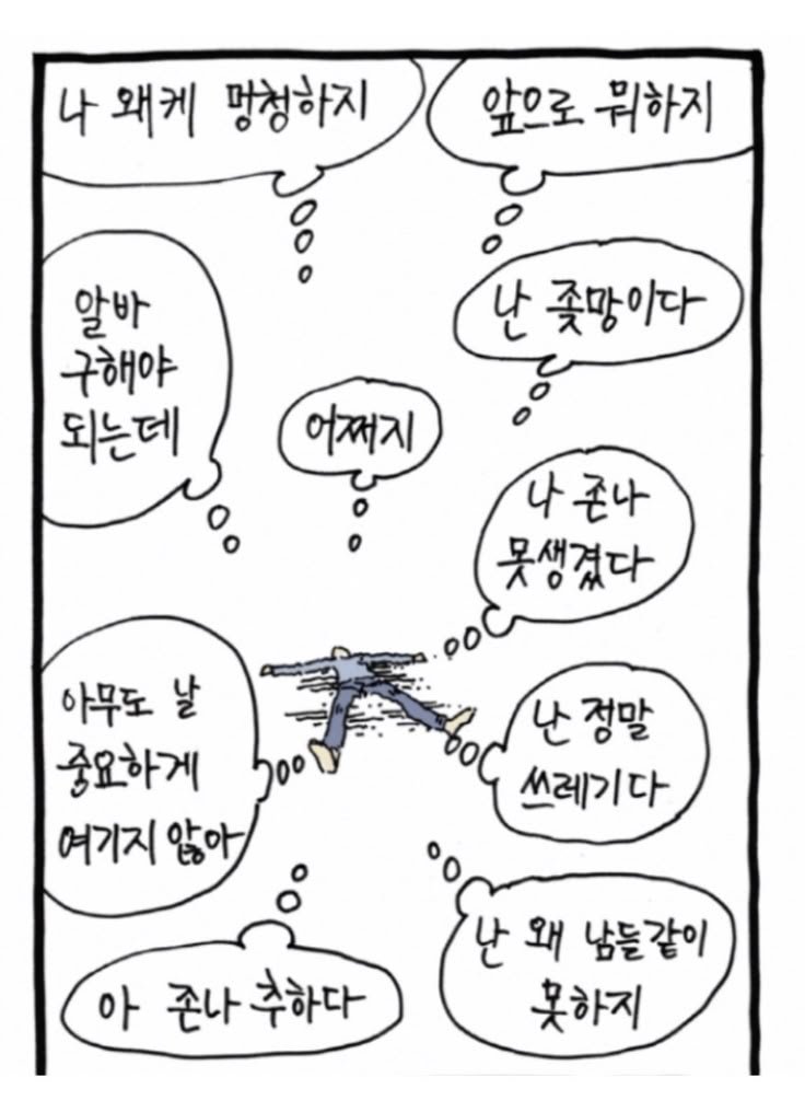 그래 나도 안다. 내가 남들만큼 열심히 안 했을 수도 있고, 남들보다 조금 충동적이었을 수도 있고, 변덕이 심했을 수도 있다. 세상 물정을 몰랐을 수도 있고, 세상의 취업문이 이렇게 좁다는 것도 몰랐을 것이다. 그리고 무엇보다 나에게는 죽을힘을 다해 견디는 힘이 부족했다. 난 나약하고, 게으르고, 사회에 도움이 되지 않는 그저 그런 실패한 청년의 삶을 그린 듯한 모습을 하고 있다.
