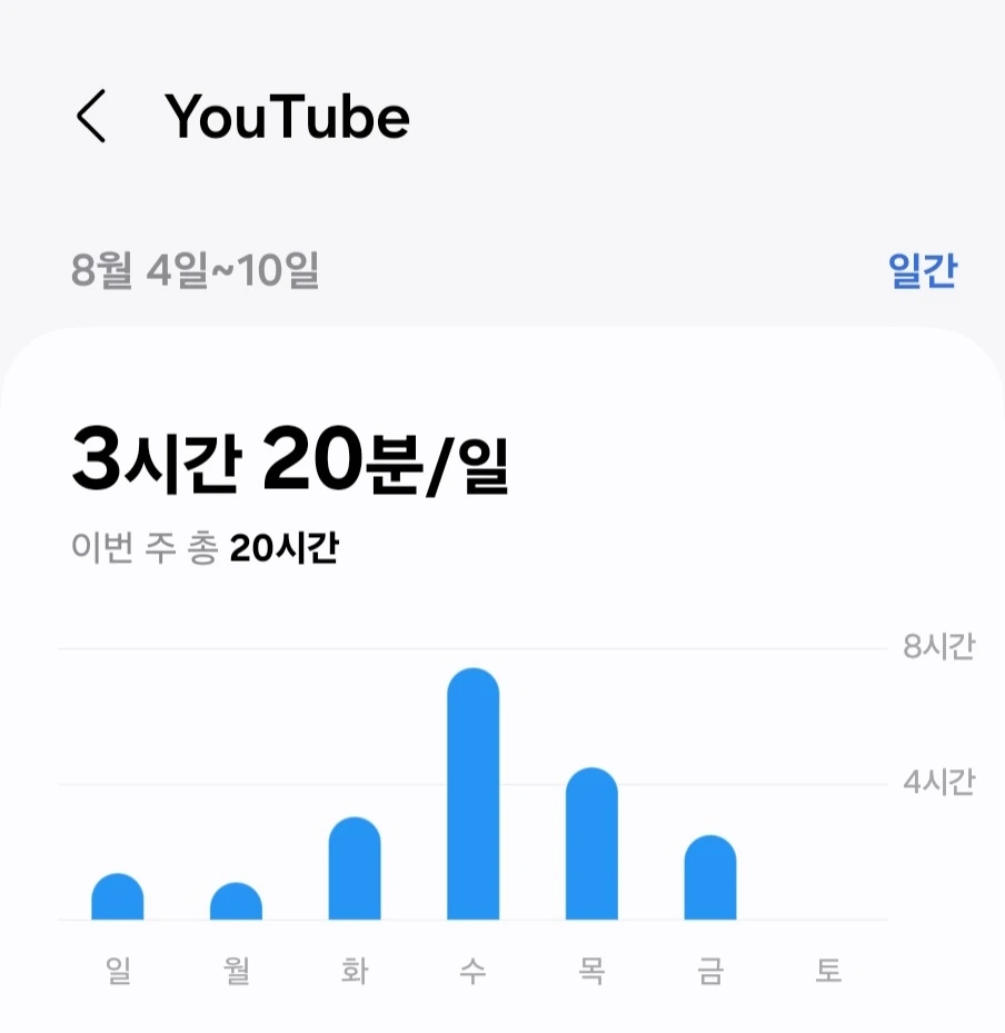 나에게 핸드폰이 의미하는 것은 정말로 크다. 때로 저렇게 8시간이나 되는 시간을 유튜브에 쏟은 이유는 도피하기 위함이였다.