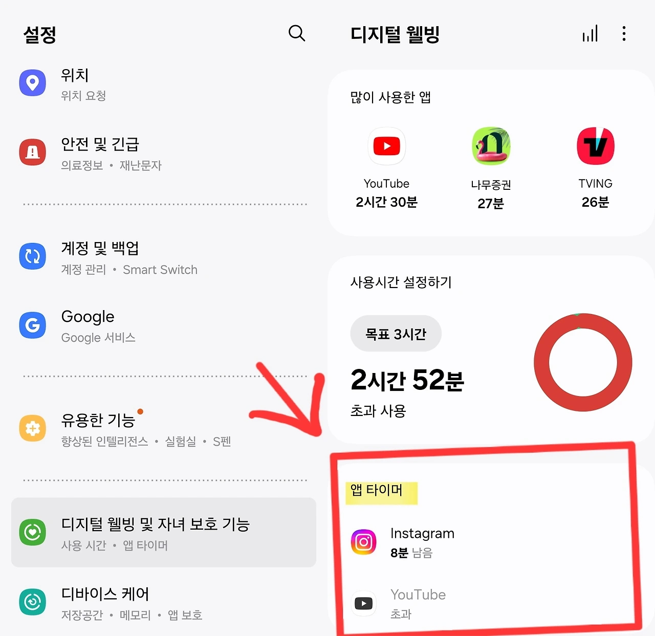 삼성 핸드폰 설정 > 디지털 웰빙 > 앱 타이머에는 일정 시간 어플을 사용하면 어플을 차단할 수 있는 기능이 있다. 물론 매번 시간을 늘리기도 하고, 때론 이 기능을 꺼두기도 했지만 이제는 이런 유혹에서 멀어지려 한다.