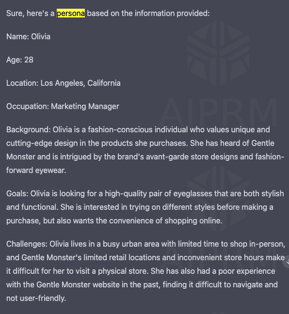 도전 과제: 올리비아는 바쁜 도시 지역에 살고 있어 직접 쇼핑할 시간이 부족하고, Gentle Monster의 매장 위치가 제한적이고 매장 운영 시간이 불편해 오프라인 매장을 방문하기 어렵습니다. 또한 과거에 젠틀몬스터 웹사이트가 탐색하기 어렵고 사용자 친화적이지 않아 좋지 않은 경험을 한 적이 있습니다.
