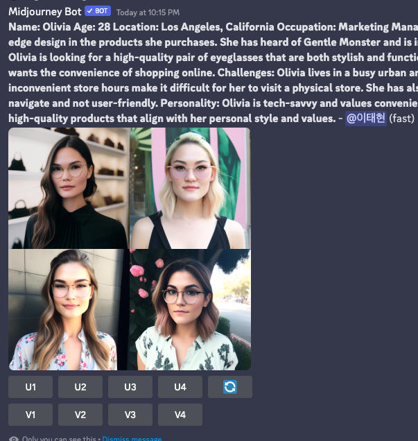 위 UX골을 활용하여 페르소나를 완성시켰습니다. Chat GPT의 가장 주된 기능인 내러티브를 활용하기 적합했습니다. 또한 그 내용 그대로 미드저니에 입력시켜 올리비아를 얻었습니다.