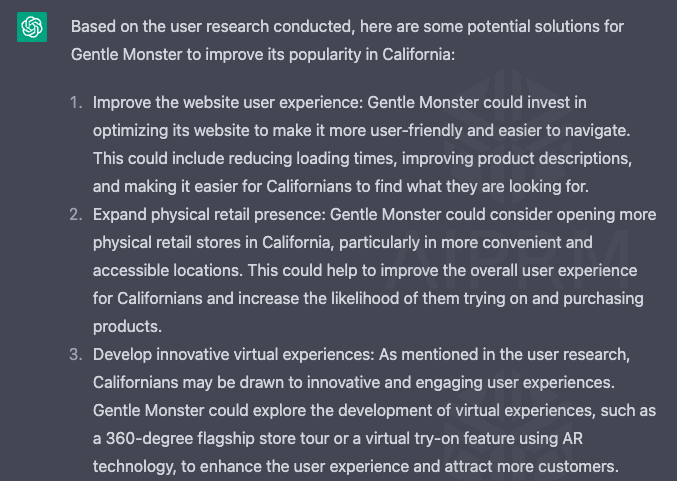 1. 웹사이트 사용성 개선 : 캘리포니아 주민들이 원하는 제품을 더 쉽게 찾을 수 있도록 하는 데 중점을 둔 젠틀몬스터 웹 사용성입니다. 제품 설명 개선, 캘리포니아 주민들이 원하는 제품을 쉽게 찾을 수 있도록 하는 것이 포함될 수 있습니다.