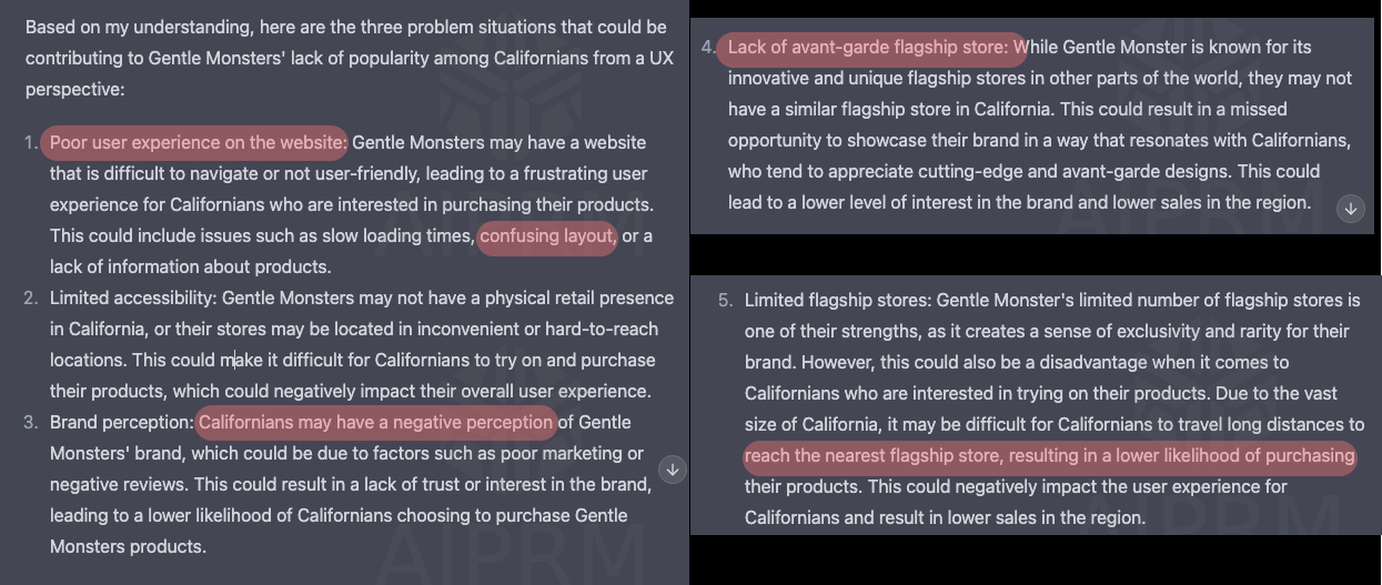 질문 : I want you to analyze why Gentle Monster is unpopular with Californians from a UX perspective and summarize the current situation in three ways.