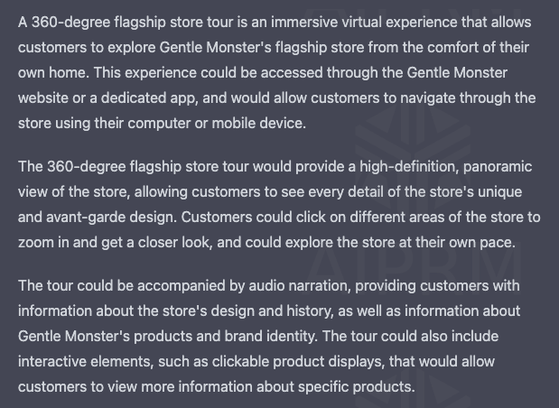 3. 웹을 활용한 360도 매장 투어 생성: 젠틀몬스터 웹을 활용한 360도 매장 투어를 생성합니다. 고객이 플래그쉽 스토어의 고유한 디자인과 제품을 몰입형 및 인터랙티브 방식으로 탐색할 수 있도록 하는 것입니다. 이를 통해 고객이 젠틀몬스터의 오프라인 매장을 방문하도록 유도하고 고객 충성도와 브랜드 참여도를 높이는 매력적이고 기억에 남는 경험을 만드는 것입니다.