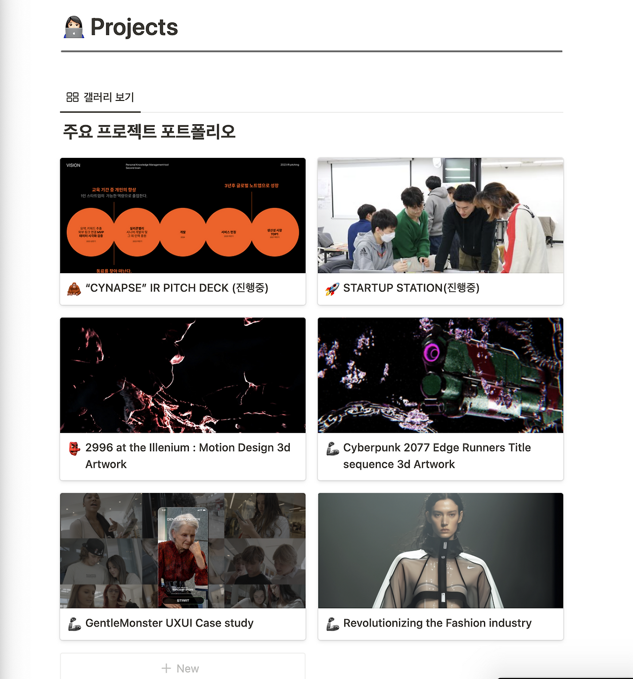 나의 경력을 계산하고 스킬별로 분류한다. 여러 프로젝트를 진행했지만 가장 성과도 좋았고 지금 상황에 맞는 6개를 추렸다. 현재 진행 중인 인큐베이터 "멋쟁이사자처럼 스타트업 스테이션"과정을 추가했다. 협업에 능한 나를 보여준다. 그 아래 진짜 그래픽 작업들을 중요도에 따라 업로드한다. 그리고 내가 지금까지 생산한 모든 콘텐츠 채널을 업로드한다.