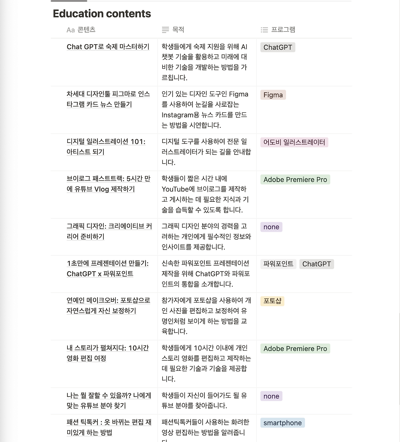 강연의 제목을 짓고 그 목적과 필요한 프로그램 순으로 나열했다. 몇 가지 걸리는 점도 존재했다. 피그마와 같은 툴이 학교 실습실에 있나? 그렇다 하더라도 사용해도 되는 건가? 우선 그 문제는 다양한 무료 대체툴이 있으니 넘어간다. 특히 요즘 꽂혀있는 생성형 AI를 활용할 방안을 생각해 봤다. 결국 이 아이들의 필수 역량은 AI를 어떻게 활용하느냐에 달렸을 거니까. 그에 조금이라도 보탬이 된다면 그것만으로 가치는 충분하다.