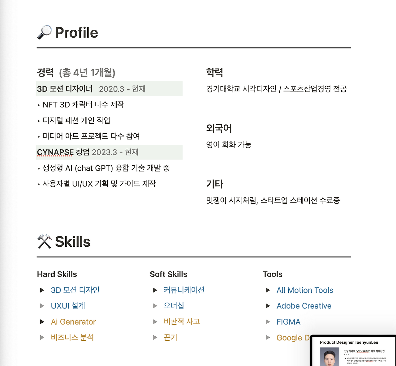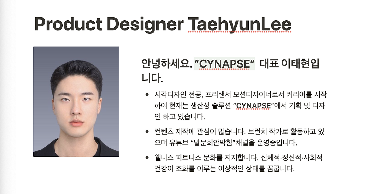 우선 내 베이스는 ProductDesigner or MotionDesigner다. 그 위에 현재 K와 진행 중인 프로젝트 "CYNAPSE"를 얹는다. 콘텐츠 쪽 강의를 맡았으니 브런치, 유튜브 초코칩을 박아둔다. 토핑으로 나의 전공, 특화된 분야를 뿌린다. 마지막으로 내가 중요시 여기는 가치관, 웰니스 피트니스 문화를 조화롭게 버무렸다. 이 세줄이면 가장 날 표현할 수 있다. 클라이언트(선생님 or학생)들에게 나를 소개한다면 이 정도면 충분하겠다.