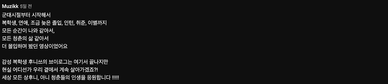 문상훈이 하는 모든 개그를 사랑했다. 그가 하는 폐급짓에 희열을 느꼈다. 전역 후에는 후니쓰도 곧이어 복학생브이로그로 돌아가 절묘하게 나와 시기가 겹쳤다. 여러 시기가 겹치며 후니쓰는 이제 졸업을 하게 되었는데 마지막 찌니꾸와의 이별까지 완벽한 청춘드라마의 완성이다.
