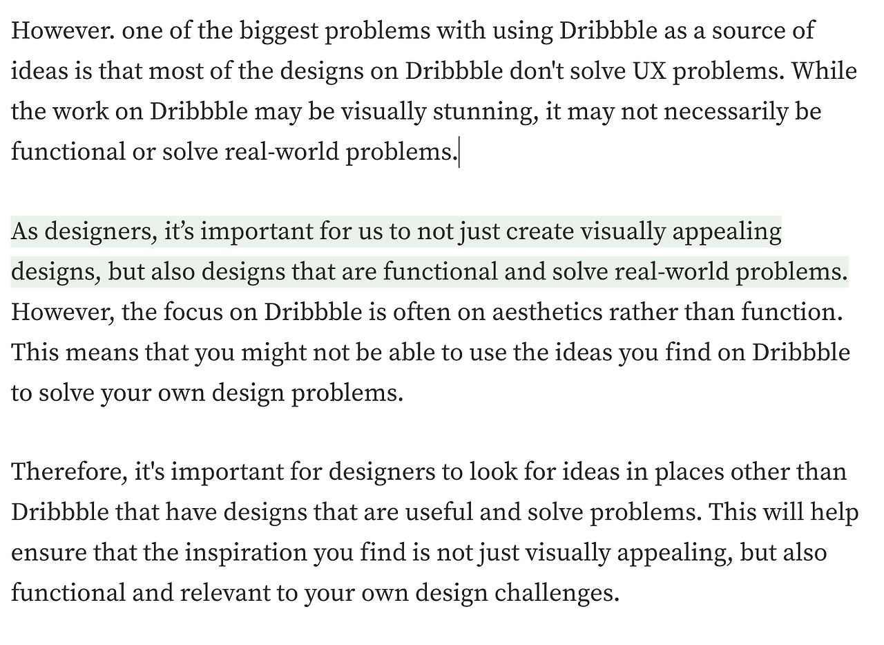 단순히 비주얼이 뛰어난 디자인이 아니라 기능적이며 현실의 문제를 해결할 수 있는 디자인이 중요하다는 것. 드리블에 올라온 화려한 UI들이 정말 문제를 해결할 수 있을까? 처음엔 혹해도 결국 더 문제를 가중시킬 것이다. 결론적으로 디자인 레퍼런스 사이트의 예쁜 디자인은 현실에서 사용할 수 없다.