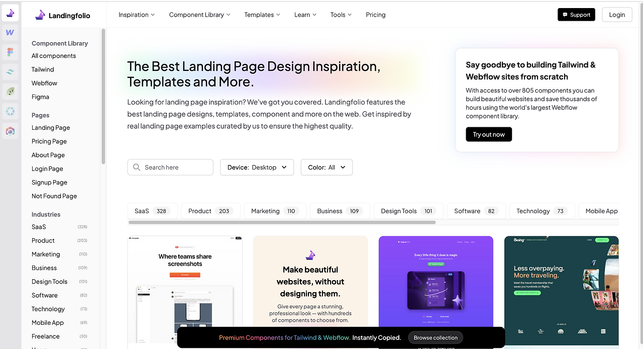 랜딩폴리오는 말 그대로 랜딩페이지만 모아둔 사이트다. 사업을 시작하는 입장에서 랜딩페이지를 많이 만들고 있는데 이렇게 보니 편하다. 다시 한번 문제해결에 초점을 맞춘 레퍼런스 사이트가 필요하단 생각이 든다. 피그마와 웹플로우 컴포넌트도 팔고 있다.
