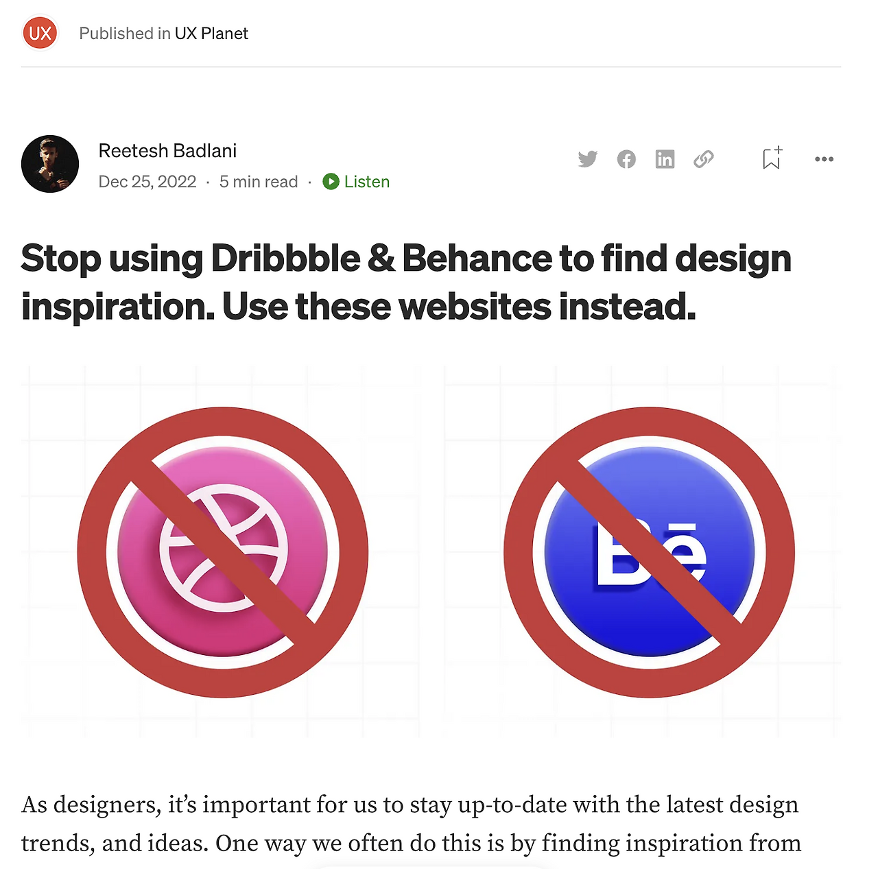 미디엄에 올라오는 UX Planet은 내가 가장 좋아하는 매거진 중 하나다. 언젠가 이곳에서 영어로 자유롭게 글을 쓸 수 있으면 좋겠다고 생각한 적도 있었을 정도다. (Webflow로 개인 영어 블로그를 만들어야겠다. 지금 당장 medium보다 큰 미디어가 되겠다고 다짐했다.) 이 글에 나온 내용이 많은 디자이너들에게 공감할 문제에 대해 다뤄줬다. 그놈의 비핸스와 드리블... 왜 이렇게 잘하는 사람들은 많고 내 작업물은 초라한지!
