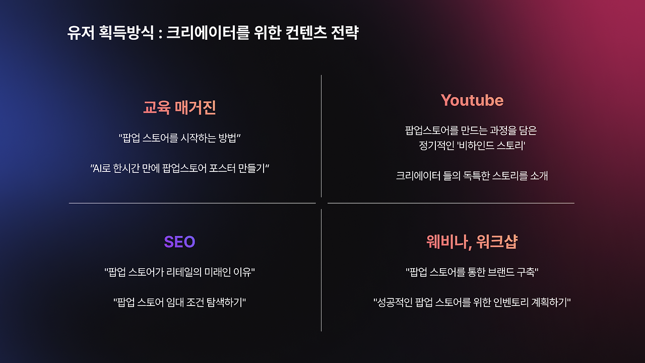 가장 좋은 걸 먼저 주자. 우리 프로젝트에 참여할 수 있을 만큼 실력을 키울 수 있게 재미있고 쉬운 콘텐츠를 만든다. 그렇게 네 가지 컨텐츠 방향을 정했고 "팝업 스토어를 시작하는 방법""AI로 한 시간 만에 팝업스토어 포스터 만들기"등의 교육 쪽을 메인으로 잡고 간다. ) 그 외에 부가적으론 메이킹 필름, 웨비나, SEO정도가 있다.)