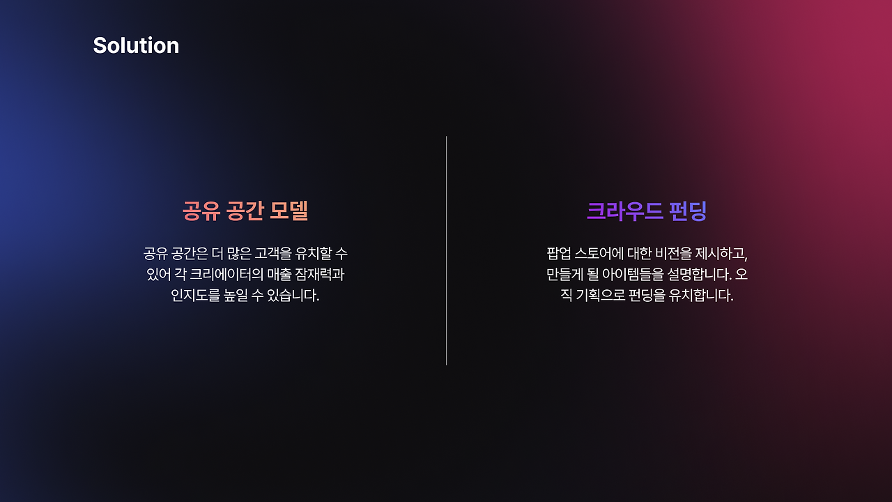 한 공간을 공유해서 비용을 낸다면 가격 부담을 줄일 수 있다. 30cm부터 1m까지 마이크로 한 단위로도 나눠낼 수 있지 않을까? 작업물이 부족한 문제는 덤으로 해결된다. 남은 문제는 재고처리인데, 재고가 남지 않게 하면 된다. 팝업 공간에 대한 기획, 비전, 참여하는 사람들의 가치를 담은 진실된 랜딩페이지면 크라우드펀딩을 할 수 있지 않을까? 두 가지 솔루션이 등장했다.