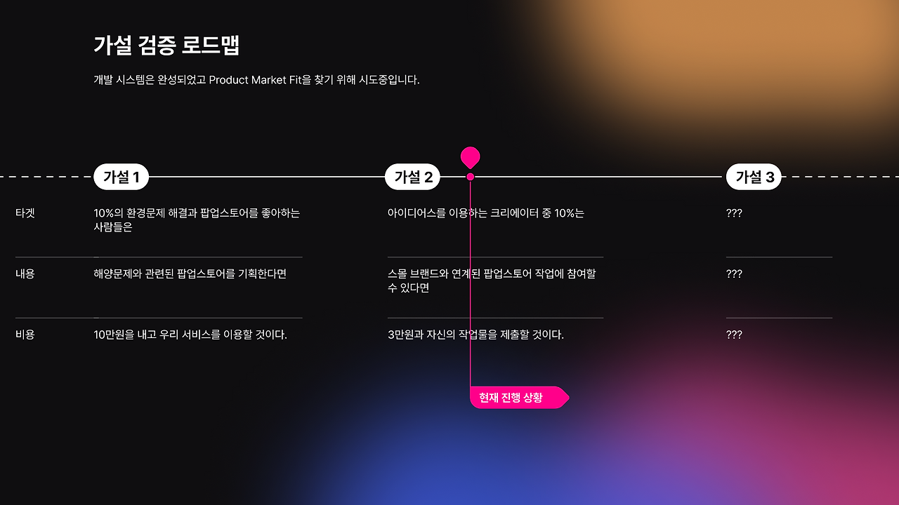 이 수정사항을 들고 두 번째 가설을 검증하려 한다. "아이디어스를 이용하는 크리에이터 중 10%는 스몰브랜드와의 팝업스토어 콜라보에 참여할 수 있다면 참가비 3만 원과 작업물을 제출할 것이다" 기존에 실패지점이라 생각한 부분을 수정했다.