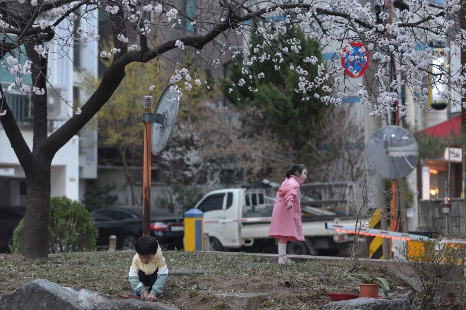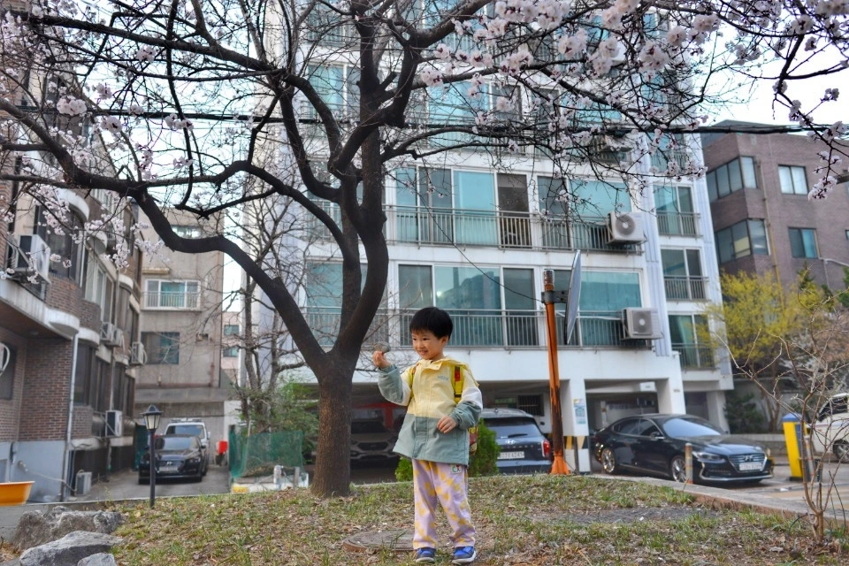 하루 사이 나무에 흰 눈이 더 많이 쌓였다. 솜사탕처럼 부푼 꽃잎을 확인하며 나무 아래에서 아이들이 뛰어논다. 나무의 몸통도 두들겨 본다.