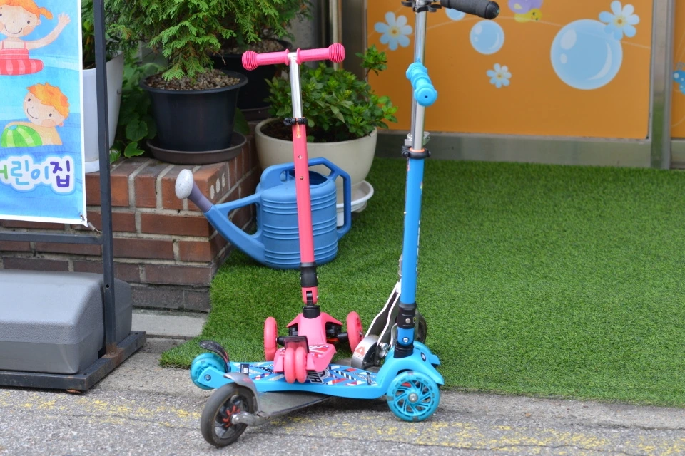 아빠는 아침에 아이들이 부탁했던 킥보드 타고 집에 오고싶다는 말을 기억해 3개의 킥보드를 합체 후 어린이집 앞에 주차했다.