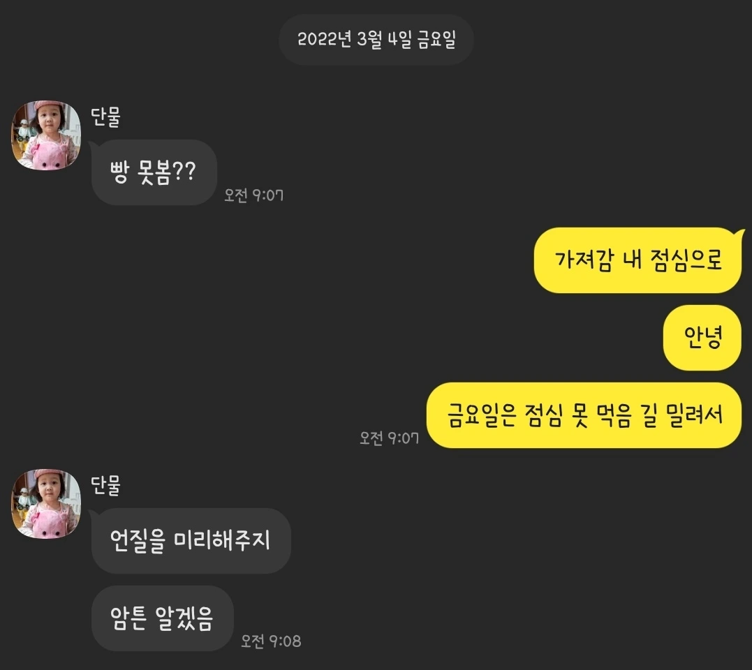 그렇지 않아도 집에 있던 빵을 점심 대용으로 챙겨 왔었다. 오전 9시 전화벨이 울린다. 회의 시간이라 안 받았다. 아이들 먹일 빵이 안 보인다고 어디 뒀는지 못 봤냐고 아내가 물었다.