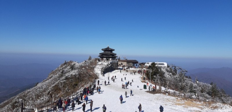 덕유산은 상고대 꽃이 활짝 피었다고 한다. 좋은산 후리지아 여자 리딩 대장님이 회원님들이 운이 좋은 것 같다고 얘기한다. 상고대 꽃은 그야말로 눈이 온다고 볼 수 있는 것도 아니고 기온이 내려가서 나무 위에 이슬이 맺힌 게 얼어서 피는 꽃이라서 아무 때나 볼 수 있는 게 아니다. 새벽에 꿈속에서도 산행하는 꿈을 꾸었는데, 멋진 상고대 풍광 속에서 순백의 여인이 되어보고 싶다. 첫사랑처럼 시린 마음으로. 나는 C 코스로 가려고 한다. 좀 많이 쉬운 코스다. 곤돌라 타고 올라갔다가 향적봉 정상 찍고 중봉 갔다가 다시 향적봉 들렀다 또 곤돌라 타고 내려올 예정이다. 옆 짝꿍이 100대 명산 다 찍고 어게인 하고 있다는데, 좀 쉽게 여유 있게 오르고 있단다. 친구 따라 강남 가는 경우가 되겠다. 곤돌라 타고 올라가서 산을 오르기 시작하자마자 상고대 눈꽃이 너무 멋지다! 뽀드득뽀드득 눈 쌓인 길을 걸어 상고대 눈꽃이 핀 풍경 속으로 걸어 들어가노라니 이것이 꿈인지 생시인지 싶다. 올 들어 이렇게 많은 눈은 처음이다! 물론 보기 어려운 상고대 꽃도 하염없이 보고 또 본다. 파아란 하늘에 순백의 눈꽃, 이럴 때는 하얀 면사포를 쓴 신부가 되어 가슴이 마구 부풀어 오른다. 향적봉 정상에서 이모저모로 조망을 하고, 길게 줄을 서서 인증숏 찍는다. 정상 인증 찍는 곳이 두 군데인데 돌비에 쓰여 있는 정상석만 줄이 길고, 하얀 네모판에 글씨로 쓰여 있는 정상에서는 사진 찍는 이가 별로 없다. 그래도 줄 서기 싫은 사람들은 그곳에서 사진 찍는 이도 있다. 나도 이쪽저쪽에서 여러 컷으로 인증숏을 남긴다. 향적봉 뒤로 바위에도 올라가 눈꽃 조망도 하고 사진도 찍는다. 원 없이 하얀 눈 세상을 가슴에도 깊이깊이 새겨 넣는다. 향적봉 정상에서 싸온 도시락을 먹고 중봉을 향해 간다. 지나는 길에 향적봉 대피소가 있다. 저기서 하루 묵고 덕유산 종주 산행을 할 수도 있다고 한다. 함께 오른 이들은 그냥 향적봉에서 놀다 내려간단다. 그래서 나 혼자 중봉을 향해 간다. 중봉 가는 길 상고대 눈꽃도 정말 멋지다. 걷는 길도. 오늘 날씨가 완전 봄날처럼 포근해서 길에는 눈이 녹고 있지만 말이다, 주목 군락지, 야생화 군락지를 지나간다. 주목들도 상고대 눈꽃을 한껏 피워놓고 산꾼들에게 자태를 뽐내고 있다. 30여 분쯤 걸어가니 어느새 중봉 도착했다. 바라다보이는 풍경이 굽이굽이 산 능선이며 길이며 상고대 꽃을 피운 나무들이며 다 멋진데, 사진을 찍으려고 보니 배터리가 아웃되었다. 여벌 충전지를 가져왔는데 차에 두고 와서 아쉽게도 중봉 표정을 못 담는다. 초반에 산 오르면서 상고대 눈꽃에 취해서 동영상 두 번 찍었더니만 그게 배터리를 많이 써먹은 듯하다. 핸드폰을 배낭 작은 주머니에 집어넣고 걸음을 빨리해서 곤돌라 탑승장에 오니 줄이 길고도 길다. 한 20여 분 줄 서고, 곤돌라 타고 내려오는 시간도 20여 분,그래도 하산하니 오후 3시 30분이다. 오후 4시 집결시간보다는 일찍 내려와 여유가 있다. 곤돌라 탈 때 함께 내려온 이들이 '100대 명산 중 덕유산이 최고'라고 그런다. 나는 아직 100대 명산 인증숏은 이제 8번 째라서, 산에 대해서 무어라 말할 수 있는 입장은 아니다. 그런데 두 분 중 한 분이 100대 명산 다 찍고 어게인 중이라면서 '덕유산 최고'를 외치니 설득력이 있어 보인다. 눈 타령을 얼마나 했는지 이런 멋진 설산을 다 올라본다. 사람은 일단은 꿈을 꾸고 봐야 한다. 눈꽃, 눈 산행, 꿈까지 꿔가며 소원을 하니 오늘 같은 날이 있는 것이다.