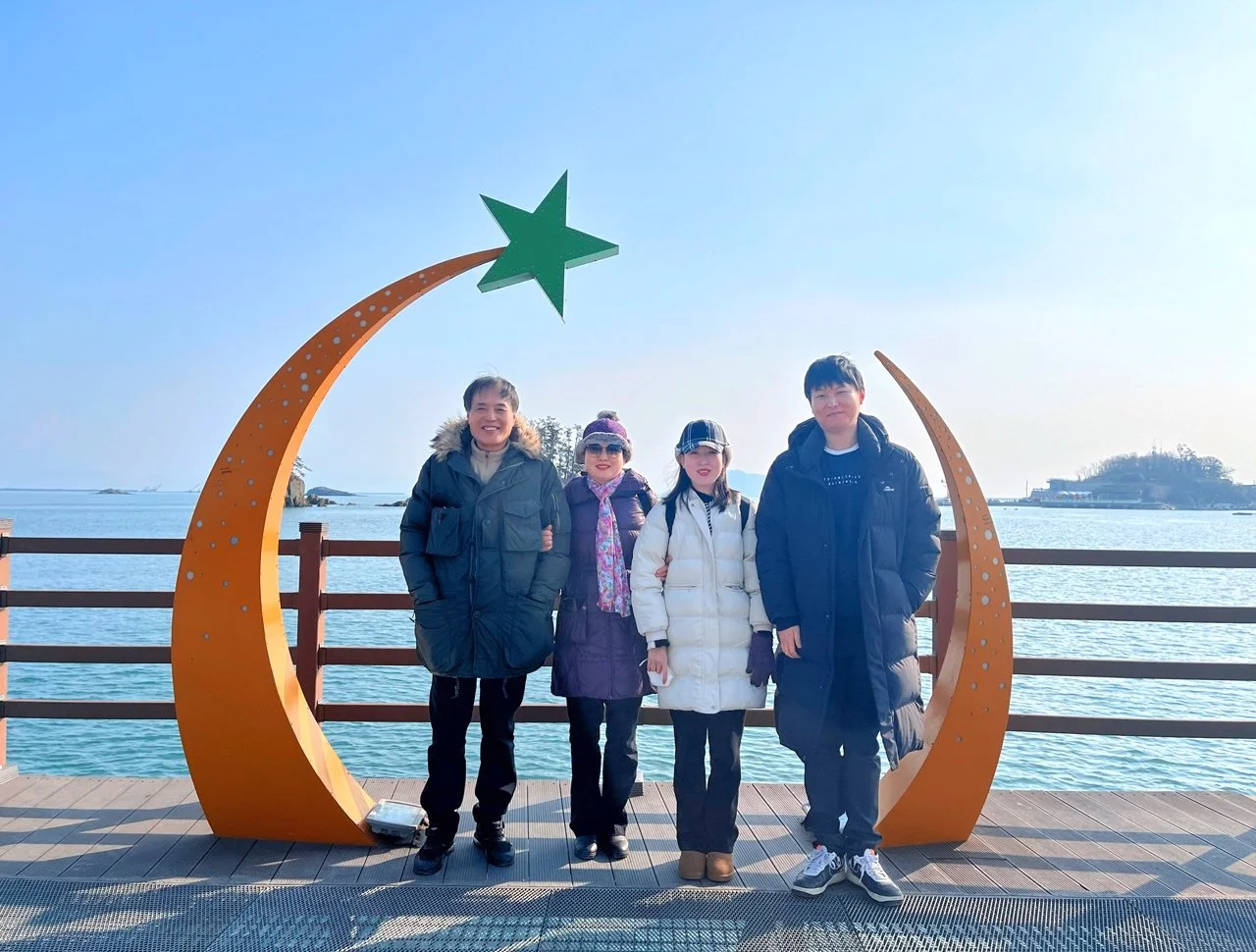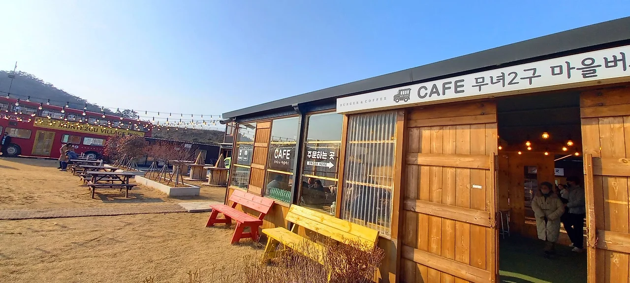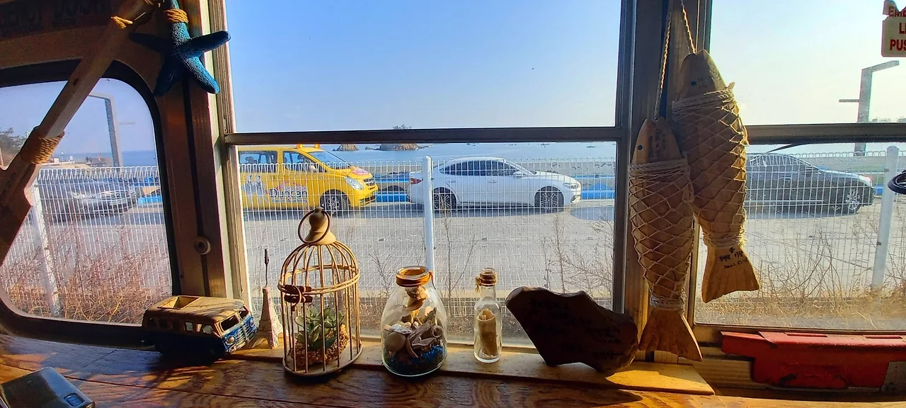 무녀도를 돌아보고 쥐똥섬이 보이는 별하트 포토존에서 가족사진을 찍고 <무녀2구 마을버스> 카페에서 차를 마신다. 값이 꽤나 비싸지만 자몽과 페퍼민트 차를 주문해서 마신다. 바다가 바라다보이는 <무녀2구 마을버스> 카페 분위기가 짱이다!