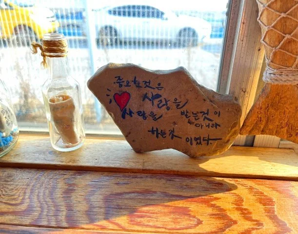 우리가 앉은 마을버스 카페에는 '중요한 것은 사랑은 받는 것이 아니라 사랑은 하는 것이었다'라는 글씨가 새겨진 나무판이 놓여있다. 바다를 바라보는 배경에 나란히 앉아서 차를 마시며 한가로운 시간을 갖는다. 무념무상이지만 포근포근한 감정의 교류, 우리가 가족이라는 것, 그 무엇을 주어도 아깝지 않은 관계, 천국의 작은 모형 가정, 그 안에서 더불어 살아가는 사람들, 가끔은 함께 여행하면서 서로를 더 소중하게 여기는 것, 이런 것이 바로 행복이라 여긴다.