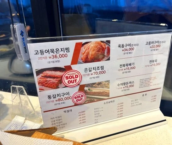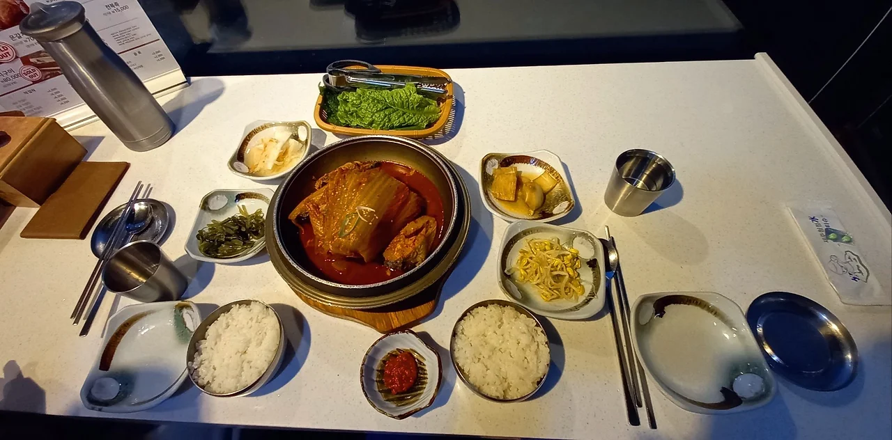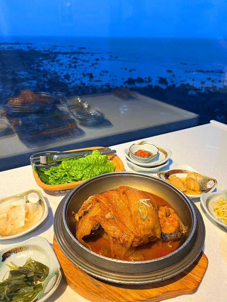 <이춘옥 고등어묵은지찜>은 예약석이라 창가 쪽 바다가 보이는 자리를 준다. 앉아서 기다리니 곧 푸짐하고 먹음직스러운 고등어묵은지찜이 나온다. 2인분에 36,000원이라 가격도 괜찮은 편이다. 가게 이름에 개인 이름이 붙은 걸 보니 '이춘옥'이란 분이 개발한 사람인가 보다.