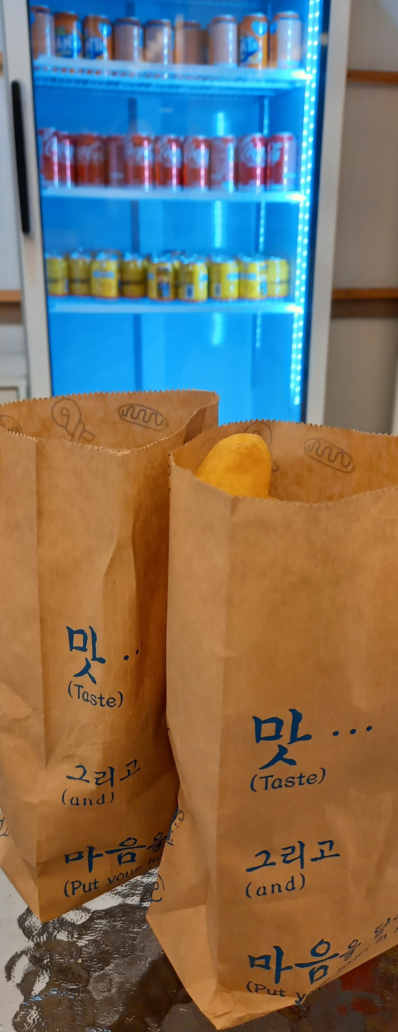 집에 가져갈 거 도넛 세트 1개를 더 주문한다. 도넛 세트에는 찹쌀꽈배기 4개, 치즈, 고구마, 단팥 도넛 해서 모두 7개가 들어있는데 6천 원이다. 나는 인절미 도넛까지 넣어서 총 8개를 샀더니 7,500원이다. 도넛을 담은 봉투에 '맛 그리고 마음을 담아서'라고 쓰여 있다.