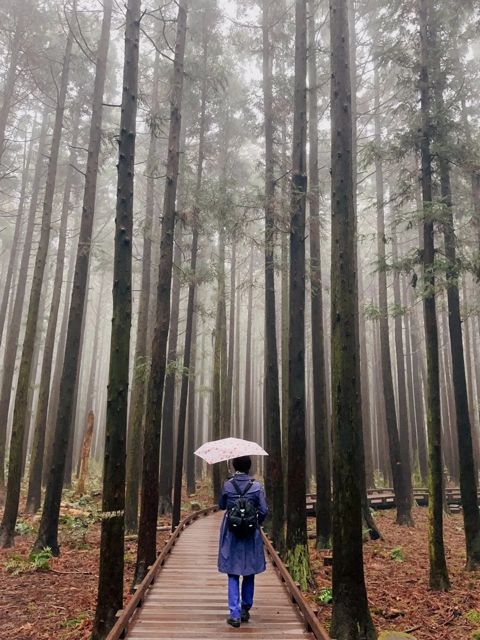 첫 번째로 간 곳은 사려니숲길이다. 삼나무 숲이 뿜어내는 피톤치드를 듬뿍 마시면서 천천히 걷는다. 운무가 가득해서 운치가 있다. 비는 안 오는데, 새벽에 내란 비로 나무에서 떨어지는 빗방울 때문에 우산을 쓰고 걷는다.