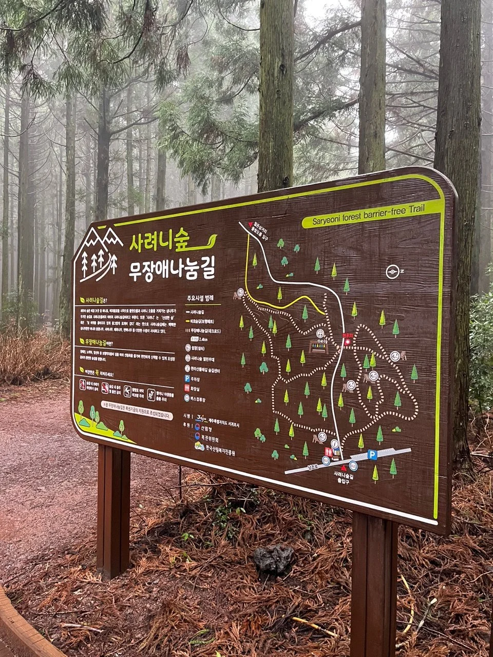 사려니숲길은 '무장애나눔길'이라는 별칭이 붙어 있는데, 장애우, 노약자, 임산부, 어린이, 누구나 편안하게 걸을 수 있도록 데크길이 잘 조성되어 있다. 해마다 숲길무대에서 에코힐링축제로 열린 음악회도 개최한단다.