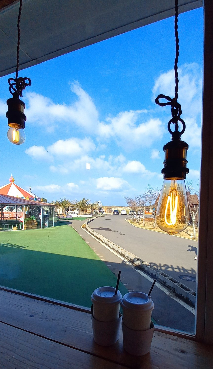 울 딸도 나도 '멍 때리기' 좋아해서 카페에서의 시간이 아늑하다. 황금색 전등 불빛 사이에 놓인 차 두 잔, 그리고 파란 하늘 아래 펼쳐진 길 풍경이 멋지다, 멋져!