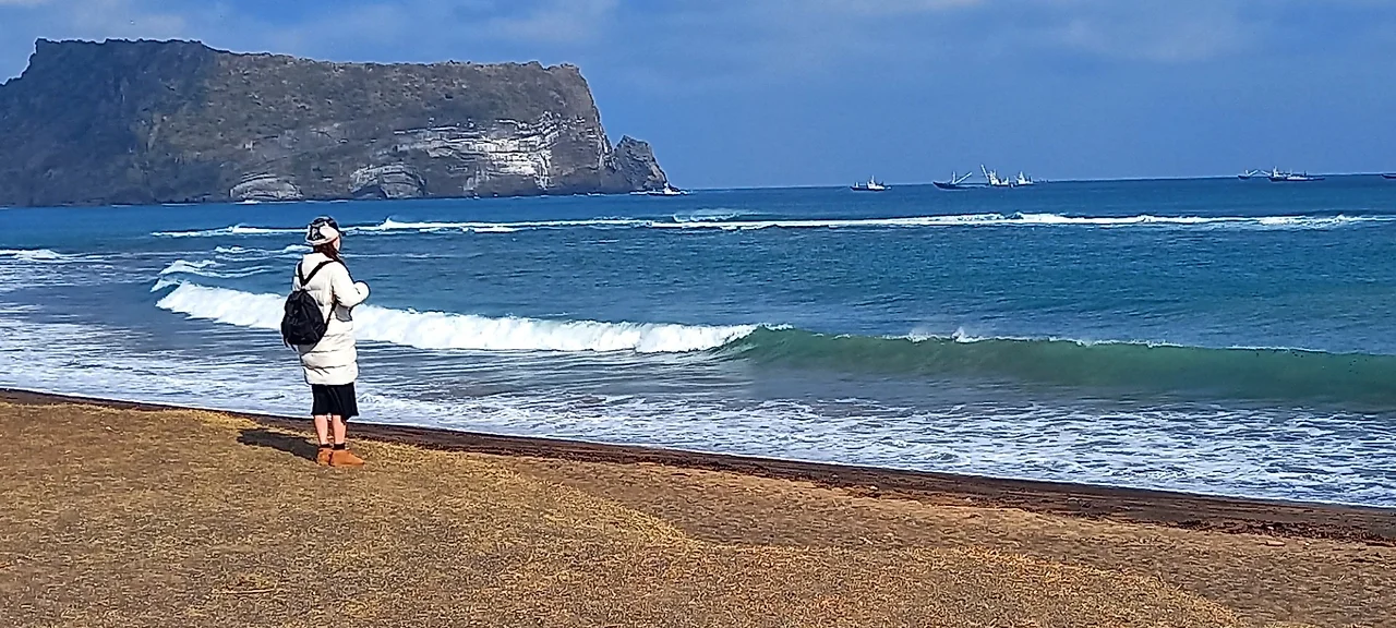 성산일출봉은 이전에 올라본 곳이라 오르지 않고 왔는데, 여기서 온전한 모습을 본다. 약간 마름모 형 성산일출봉이 바다 위에 떠있는 모습이 너무나 환상이다. 어느 예술가가 저런 그림을 그릴 수 있단 말인가! 자연만이 그릴 수 있는 활동사진이다.산이나 봉우리는 직접 오르는 것도 좋지만 조금 떨어진 곳에서 바라보는 것도 참 색다르고 신비롭다.