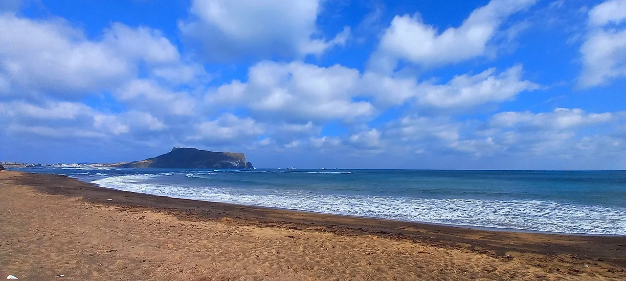 드르쿰다는 '들판을 품다'라는 뜻이란다. 성산일출봉이 훤히 보이는 멋진 조망의 해변이다. 청빛 하늘과 하얀 구름, 옥빛 바다와 하안 파도의 포말이 어찌나 맑고 예쁜지 별천지에 온 것 같다.