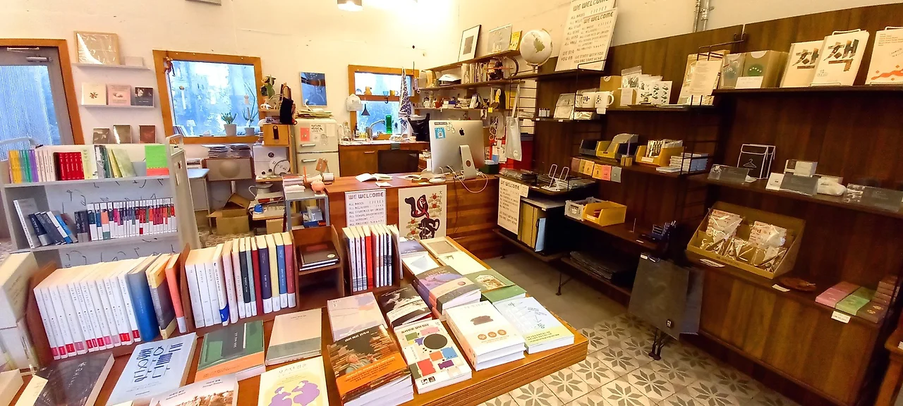 울 딸이 이 근처에 도보 10여 분 거리에 독립서점이 있다고 가서 책을 사고 싶단다. 며칠 묵은 지인 댁 사모님께 선물을 하고 싶단다. 와 있는 동안 너무나 잘해 주셔서 보답을 하고 싶어서란다. <만춘서점>으로 가서 책을 고른다. 독채건물로 하얀색, 벽돌색 건물이 두 동이 있는데, 문이 따로 달려있고 양쪽에서 같은 서점을 열고 있다. 하얀색 건물은 <만춘서점> 1호, 벽돌색 건물은 2호점이라고 한다. 우리가 갔을 때는 평일 오후라 손님은 없고 우리 둘만 책을 이것저것 꺼내서 살펴본다.