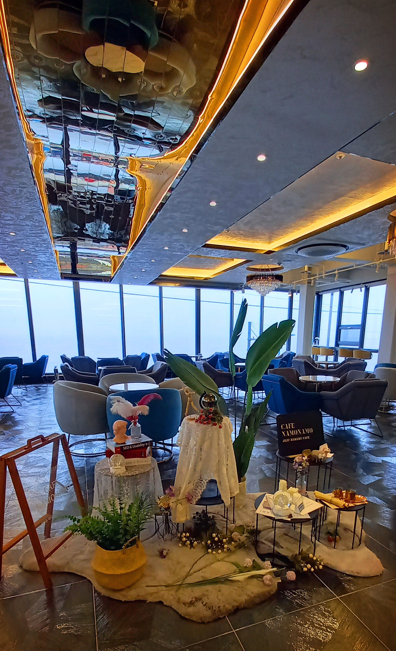 <나모나모> 카페는 제주 바다와 <무지개해안도로>와 한라산, 제주공항 활주로가 잘 보이는 곳이다. 1층부터 4층까지 있고, 5층 옥상정원이 있는데, 낮에는 자리가 없을 정도로 꽉 찬단다. 인기 있는 카페인 모양이다.