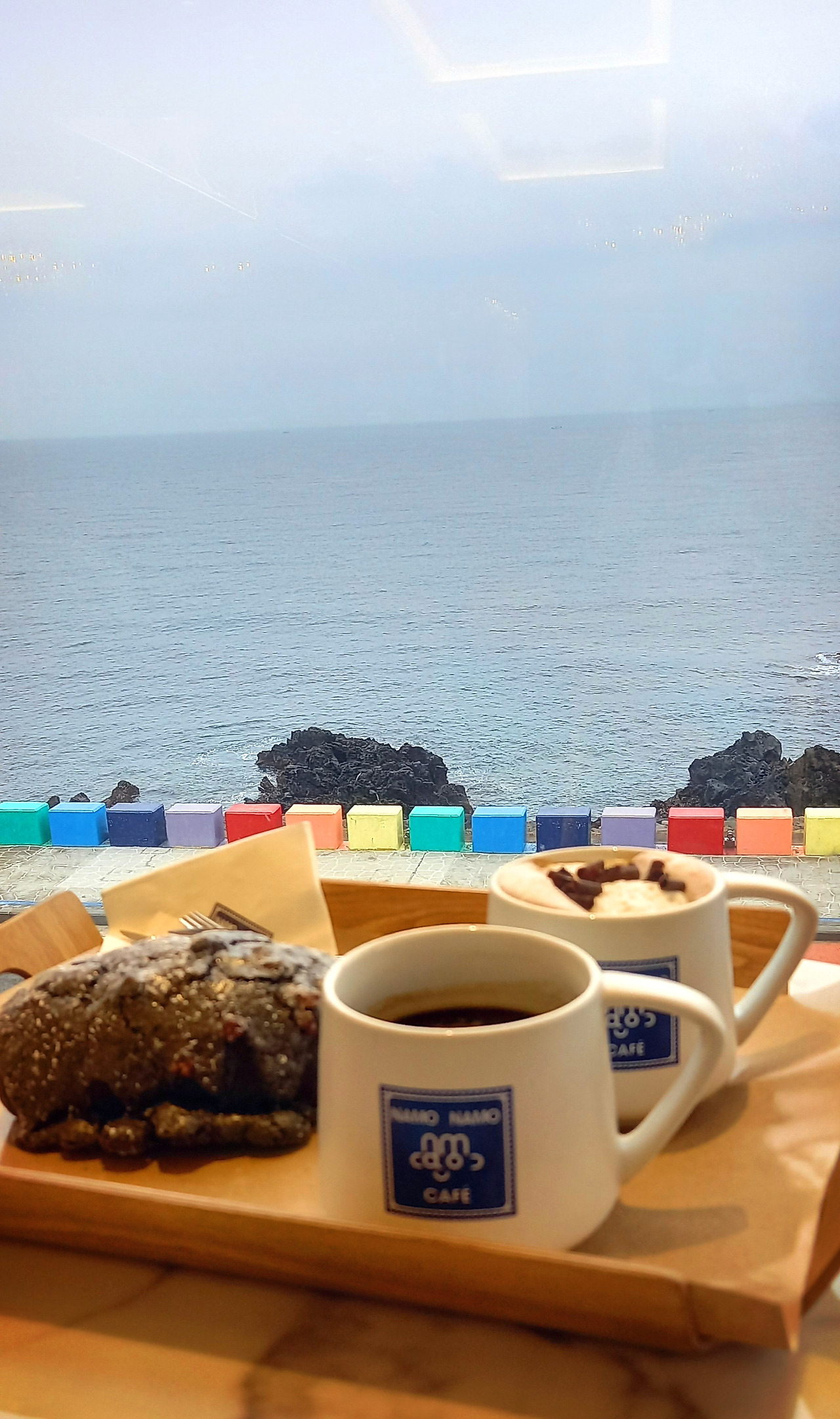 모카커피와 아메리카노, 현무암빵을 사서 2층 바다 조망이 좋은 곳에 앉아서 마시며 논다. 말없이 앉아서 바다를 바라보며 커피를 마시는 것이 참 좋다.