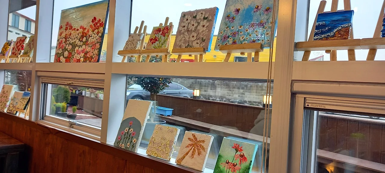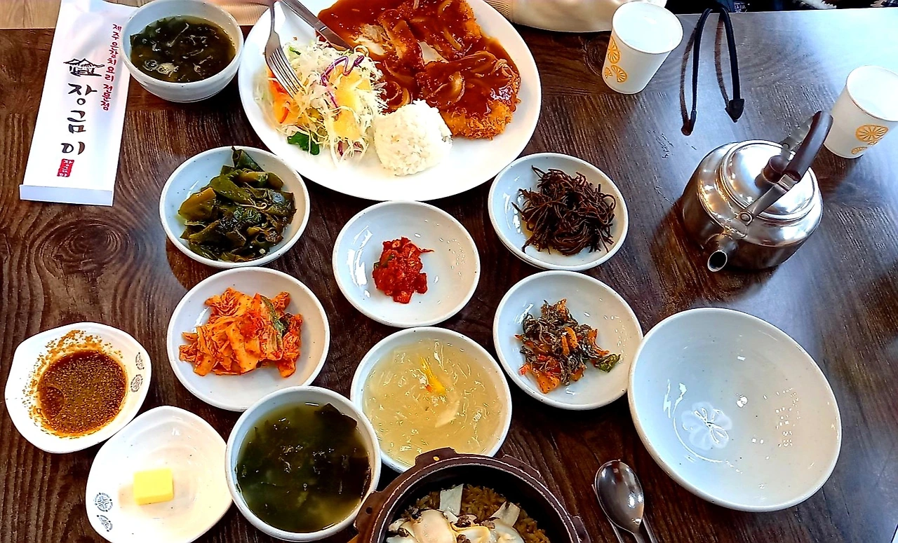 그런데 애써 찾아낸 <동백부엌> 식당을 가보니 11시 타임 식사는 최소 11시 10분 전에는 와야 되는 건데, 우리는 11시 10분에 도착해서 12시까지 기다려야 한단다. 돌아오는 비행기 탑승 시간이 1시 30분이라 시간 상 기다릴 수가 없어서 다른 식당으로 간다. <장금이> 식당이다. 전복돌솥밥과 흑돼지 돈가스로 점심식사를 한다. 식당 창가가 유화 그림으로 장식이 되어 있어서 분위기가 있다.