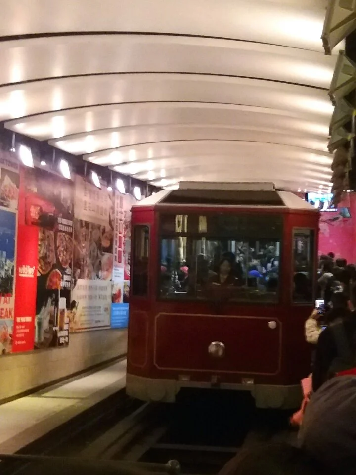 좌 : <피크 트램> 타려는 사람들 / 우 : 세 번째 기다리니 <피크 트램>이 우리를 태우러 온다.