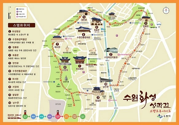 가장 먼저는 수원은 유서가 깊고 고풍스러운 도시이다. 유네스코세계문화유산 수원화성과 화성성곽길이 있다. 집에서 도보로 20여 분이면 갈 수 있다. 수원화성을 보고 화성성곽길을 천천히 한 바퀴 도는 데는 약 2시간 정도 걸린다. 집에서 출발해서 수원 남수문에서 올라가서 창룡문~동북공심돈~연무대~방화수류정~화홍문~장안문~화서문~서장대~남문(팔달문)으로 내려오면 총 3시간 정도면 집까지 올 수 있다. 지금은 열정과 체력이 있어 산행이나 여행을 즐기지만나이가 더 들면 수원화성을 일주일에 한두 번 정도 걸을 생각이다.